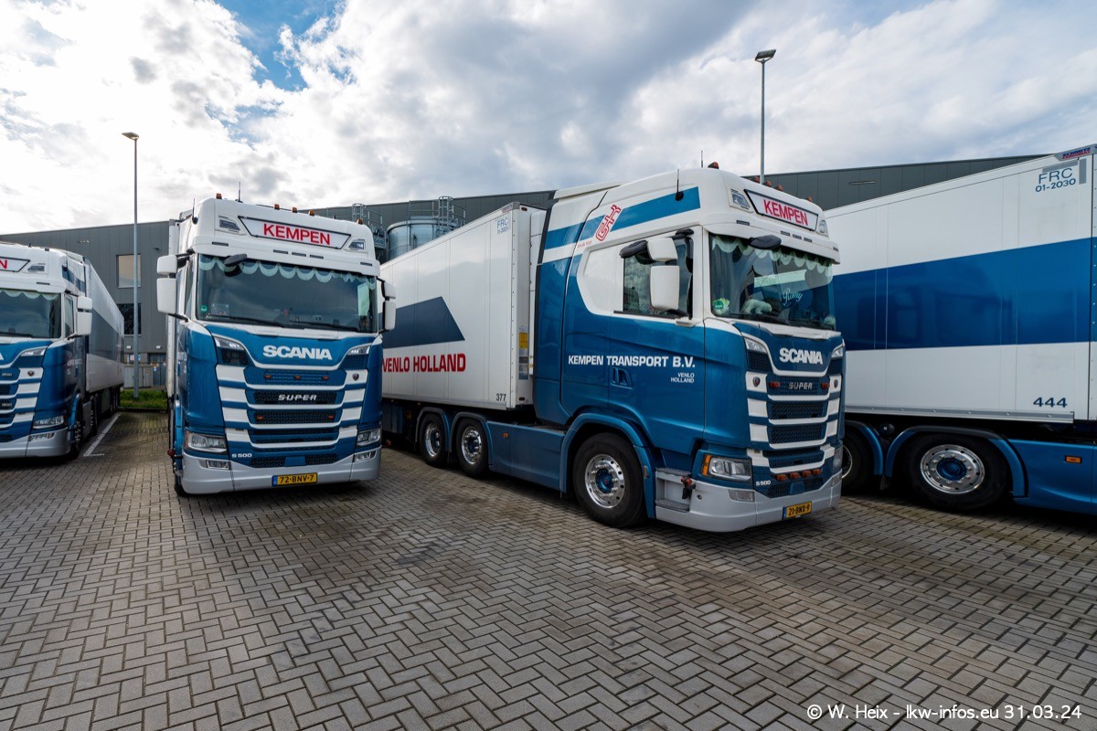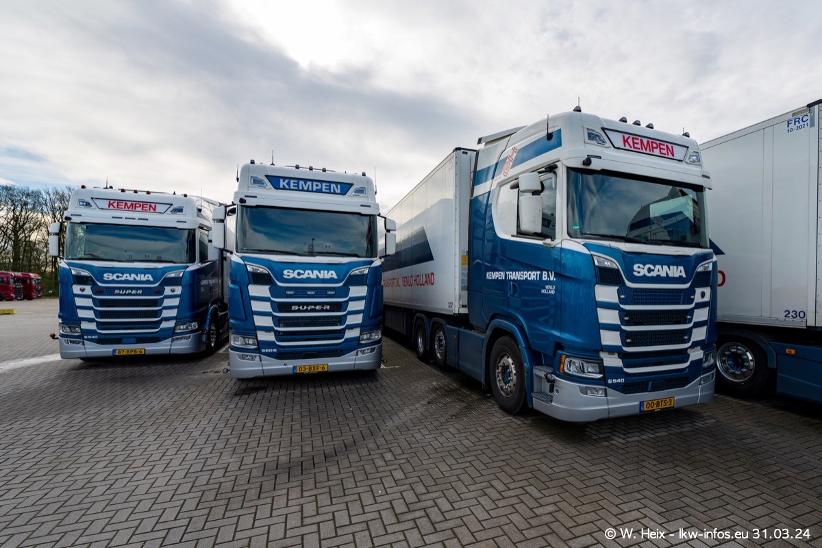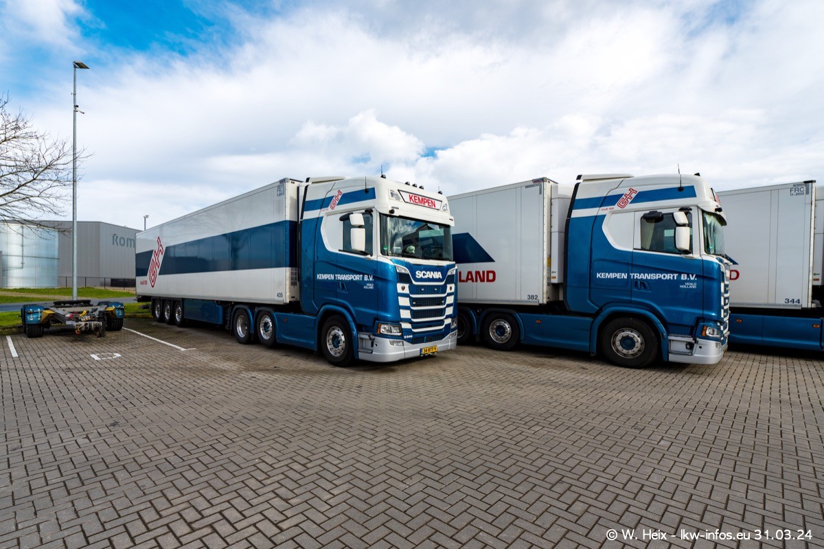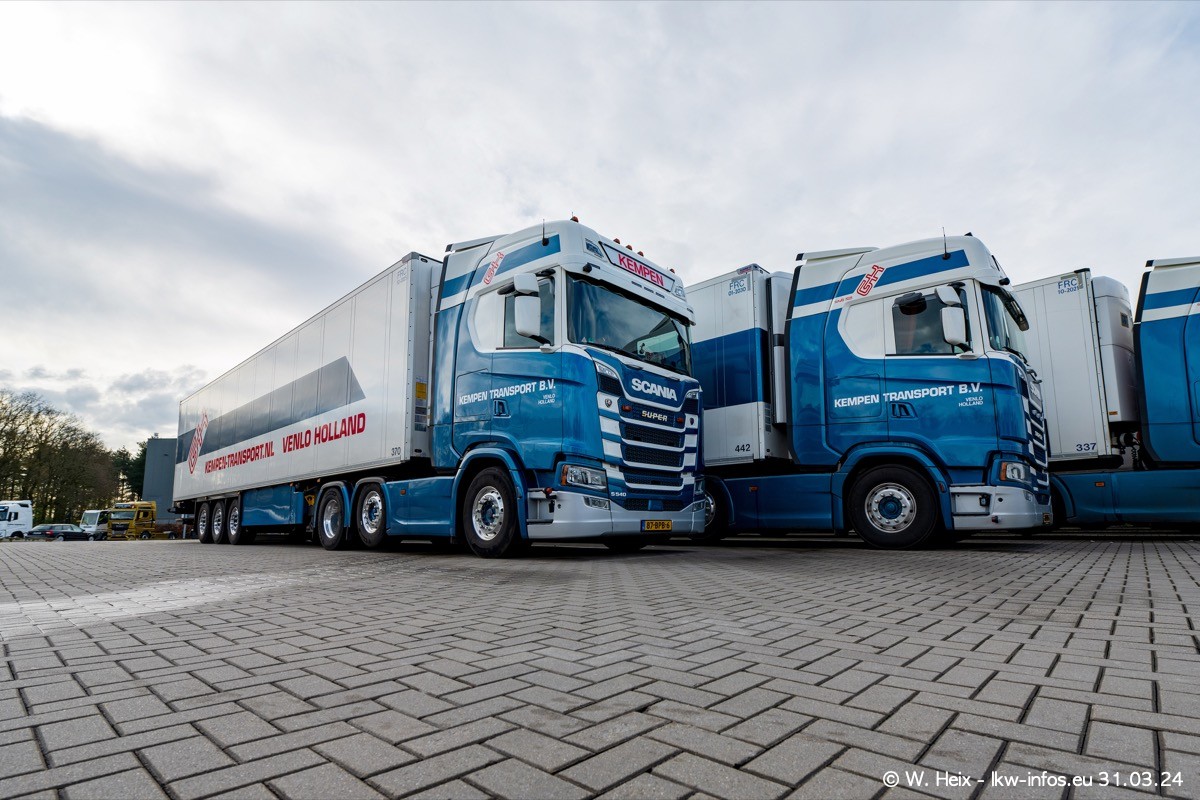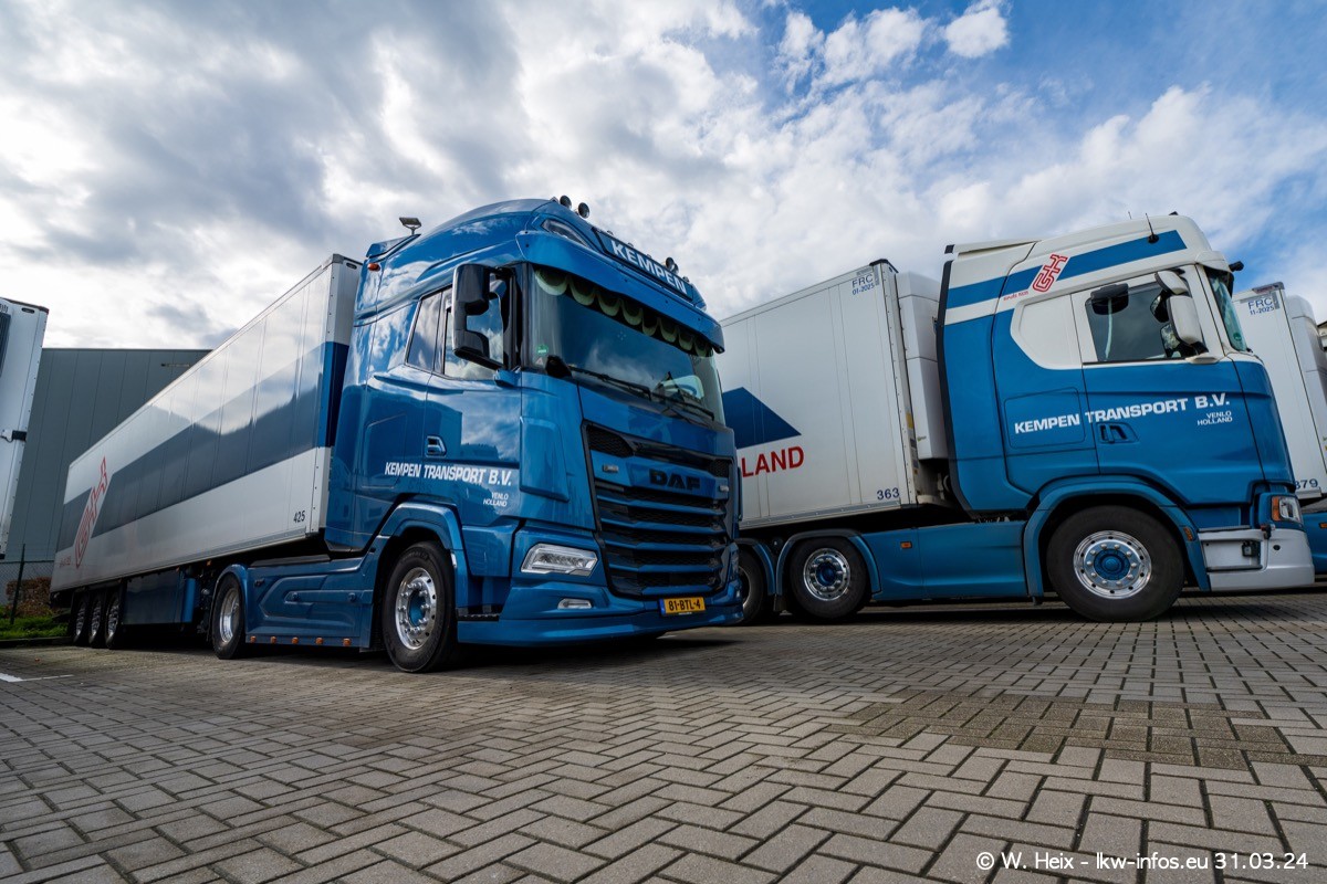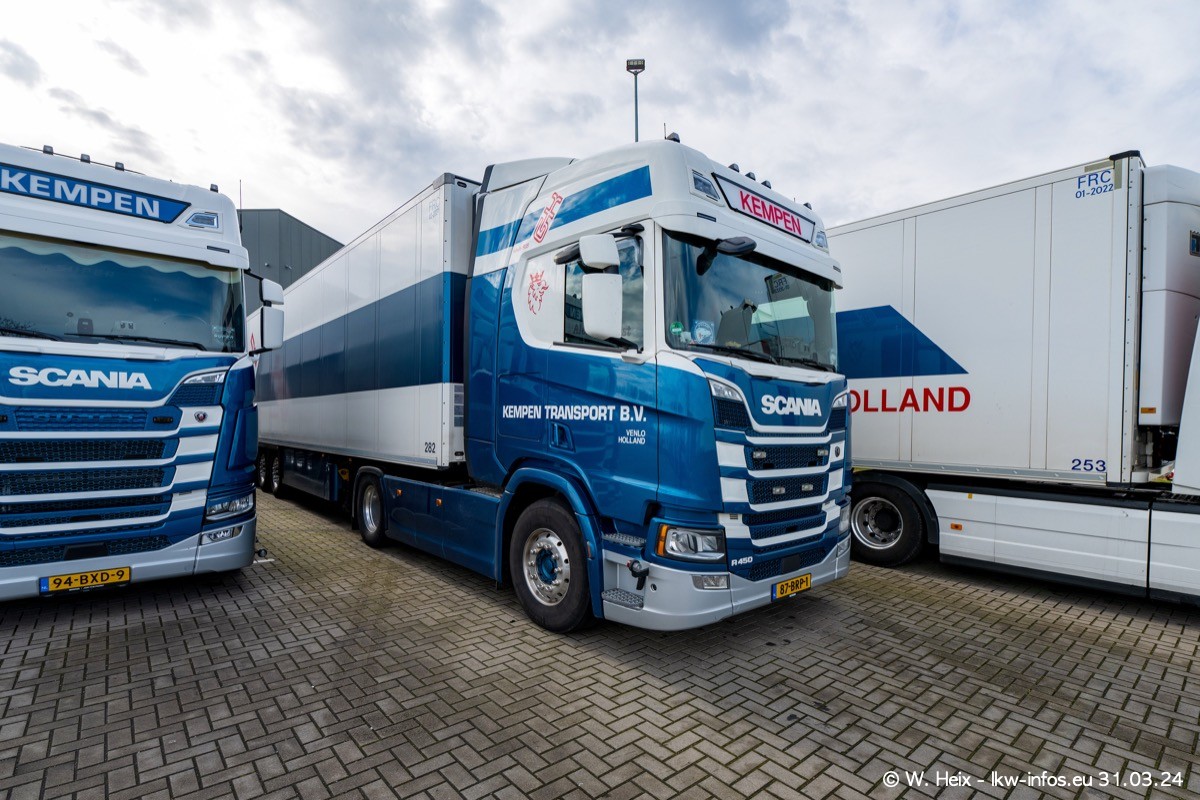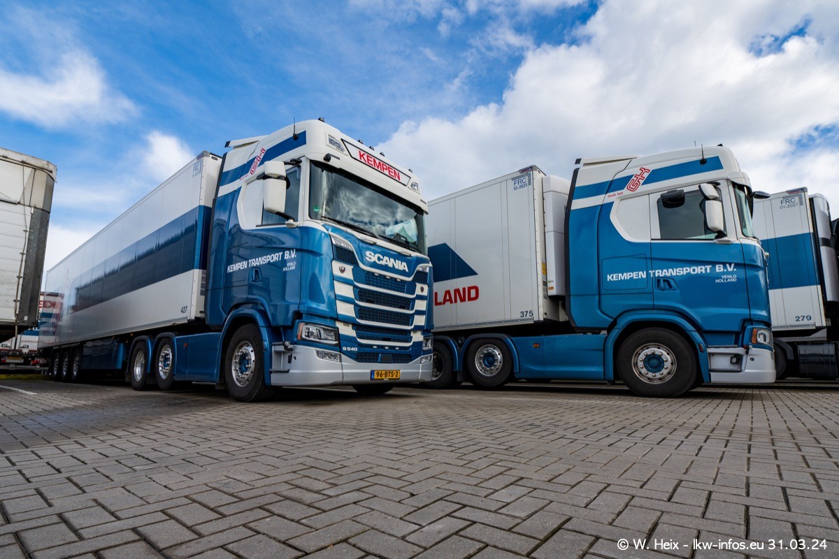 In diesem Jahr sind schon insgesamt mindestens 10 neue LKW in den Fuhrpark gekommen. Alle neuen LKW sind seit 2024 daran zu erkennen, dass aon der Fromt oben am Dach der Kempen-Schriftzug jetzt weiß ist in einem blauen Feld. Bisher war dieser immer rot auf weiß. Es waren so gut wie alle LKW zuzhause und standen auch wieder auf den Nachbargrundstücken. Diesmal konnte ich keinen SCANIA R Streamline und keinen DAF XF mehr sehen bis auf den neuen blauen DAF XG+ natürlich. Vermutlich sind jetzt alle alten SCANIA und DAF ersetzt durch VOLVO FH 5 und SCANIA R/S NextGen. Es sind natürlich auch wieder Bilder von den Chatern (Subunternehmern) in den Galerien enthalten. Auch hier tut sich immer wieder mal was.
