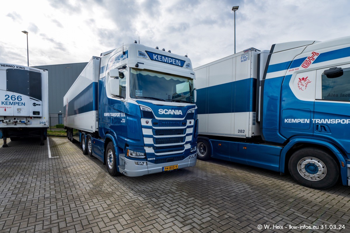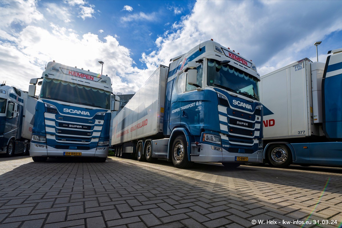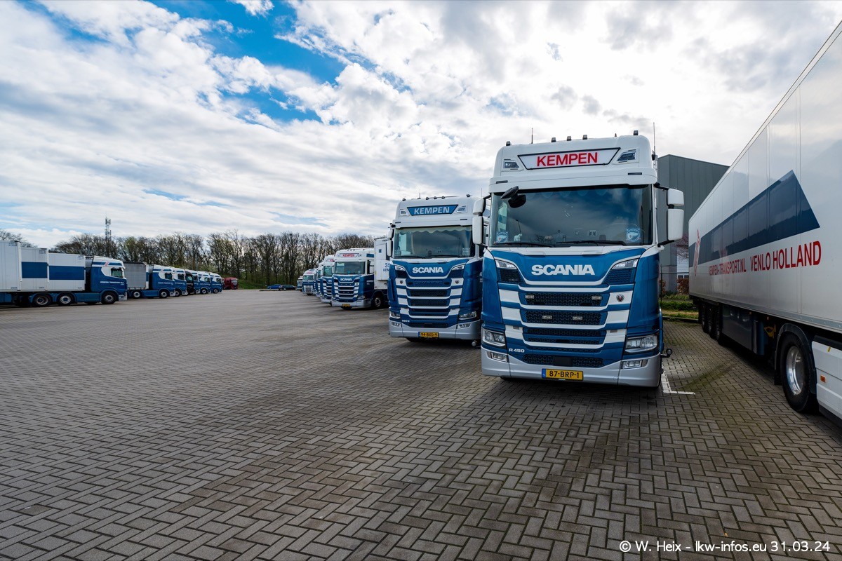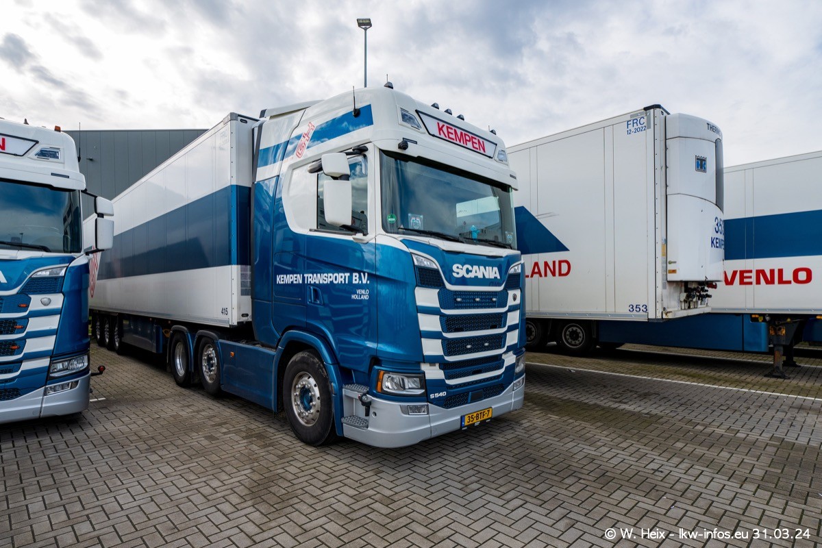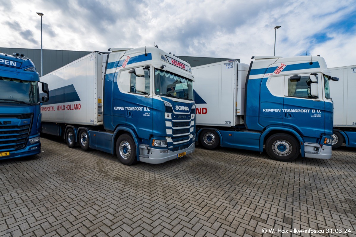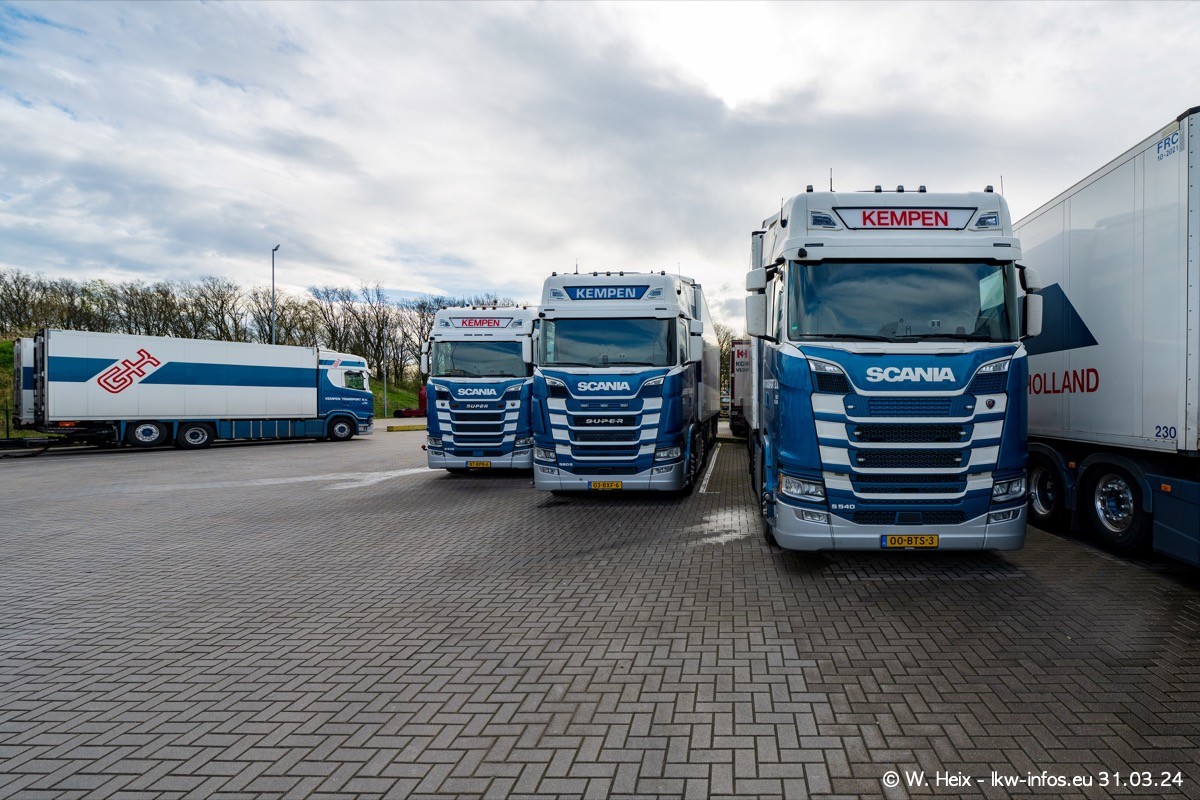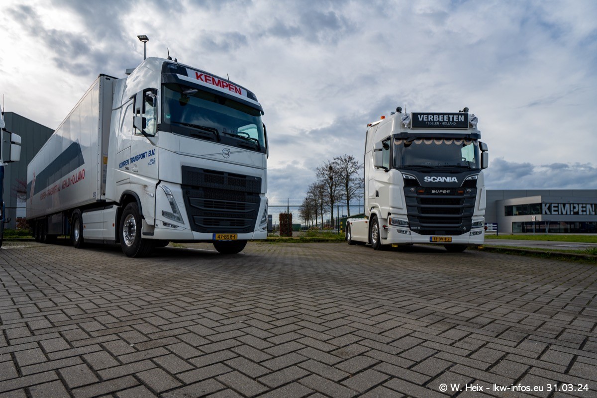 In diesem Jahr sind schon insgesamt mindestens 10 neue LKW in den Fuhrpark gekommen. Alle neuen LKW sind seit 2024 daran zu erkennen, dass aon der Fromt oben am Dach der Kempen-Schriftzug jetzt weiß ist in einem blauen Feld. Bisher war dieser immer rot auf weiß. Es waren so gut wie alle LKW zuzhause und standen auch wieder auf den Nachbargrundstücken. Diesmal konnte ich keinen SCANIA R Streamline und keinen DAF XF mehr sehen bis auf den neuen blauen DAF XG+ natürlich. Vermutlich sind jetzt alle alten SCANIA und DAF ersetzt durch VOLVO FH 5 und SCANIA R/S NextGen. Es sind natürlich auch wieder Bilder von den Chatern (Subunternehmern) in den Galerien enthalten. Auch hier tut sich immer wieder mal was.