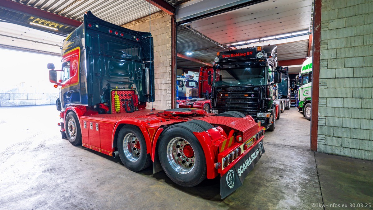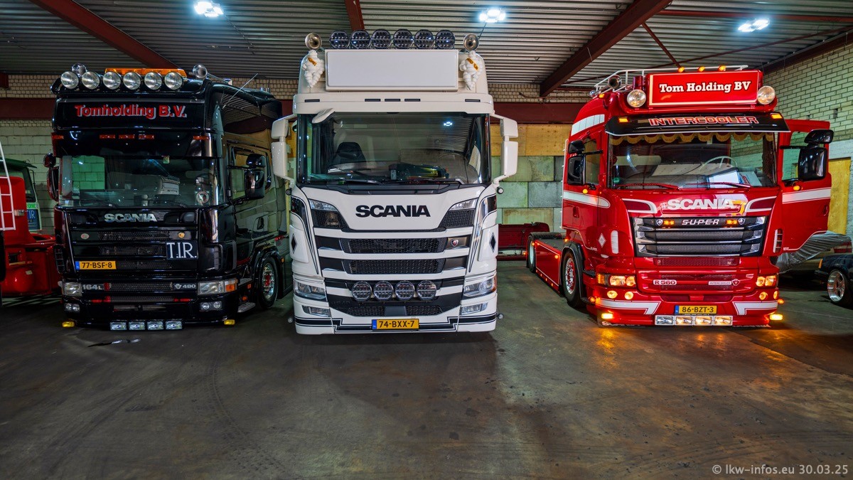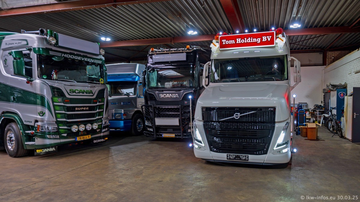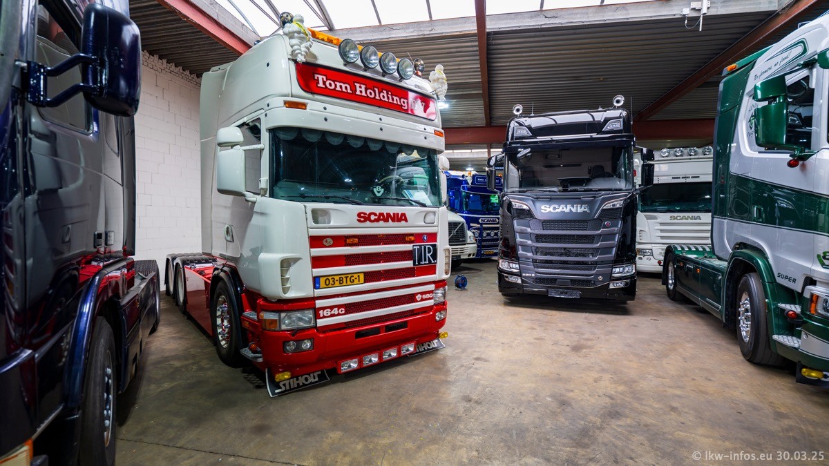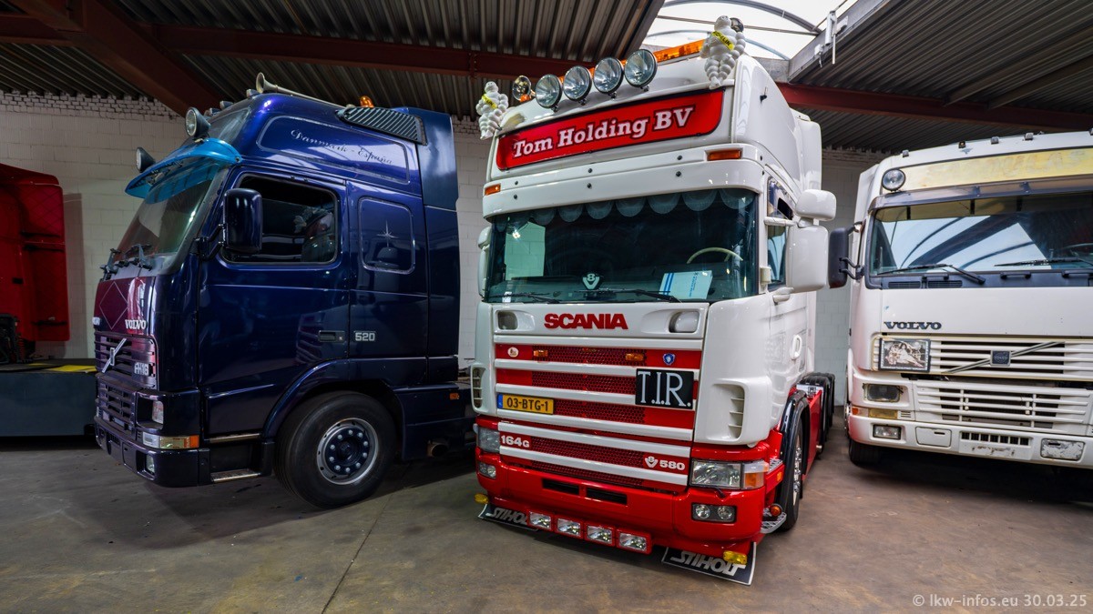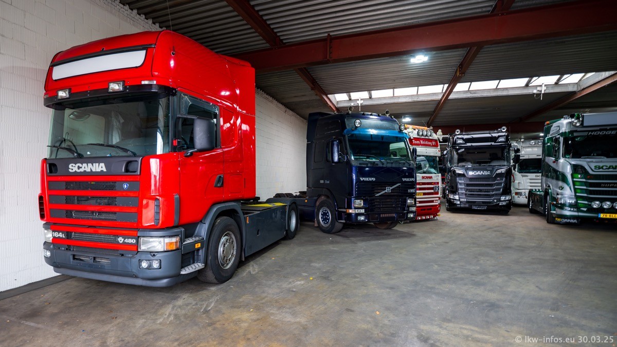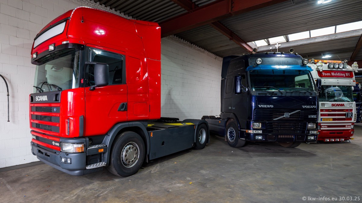 Inzwischen gibt es bei Tom Holding noch mehr Fahrzeuge als bisher, darunter auch einige neue. Der VOLVO VT 5 460 (die Nr. 15 von Vlastuin) ist neu und war eigentlich für einen Kunden in Dänemark gedacht, der das Fahrzeug aber nicht gekauft hat. Die beiden roten SCANIA 141 V8 und R 560 V8 kommen von einer bekannten deutschen Firnma und es gibt aktuell einge SCANIA V8 Showtrucks, die zum Verkauf stehen. Darunter auch wieder ein Fahrzeug von Lansdaal. Diesmal haben wir ein reines Fotoshooting gemacht da es aktuell so viele Fahrzeuge gibt. Videos und Film gibt es dann beim nächsten Besuch wieder.
