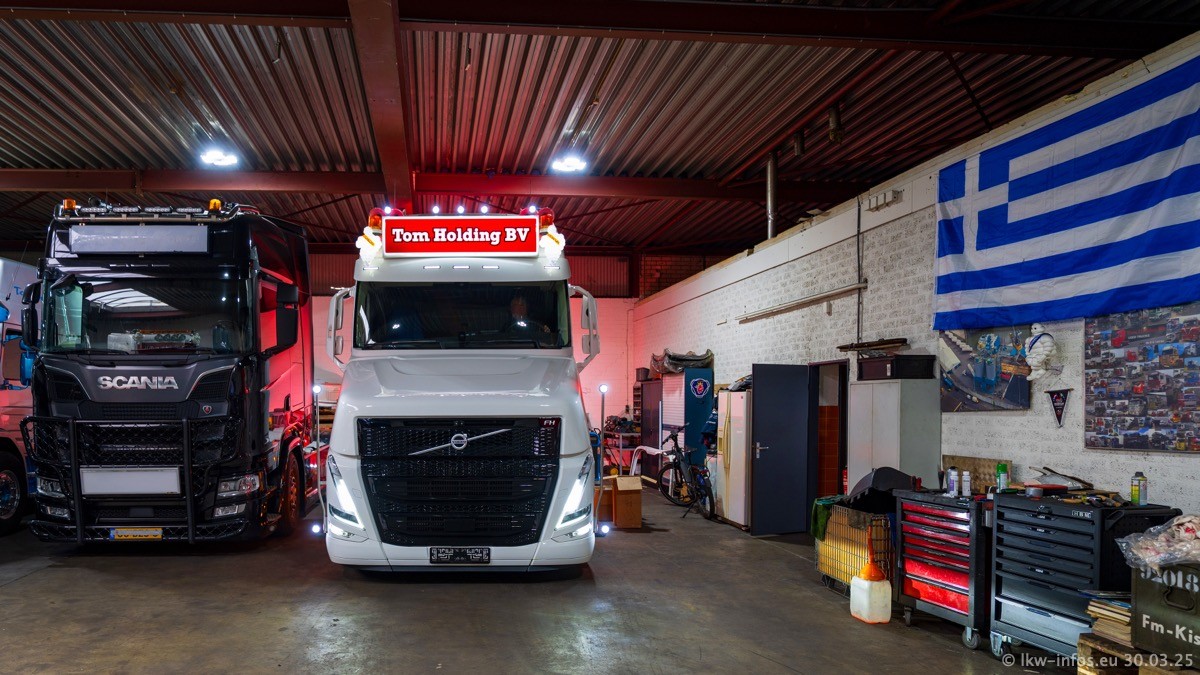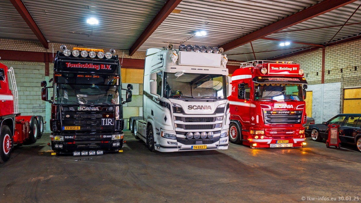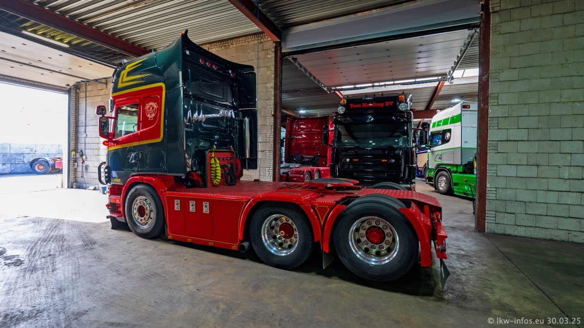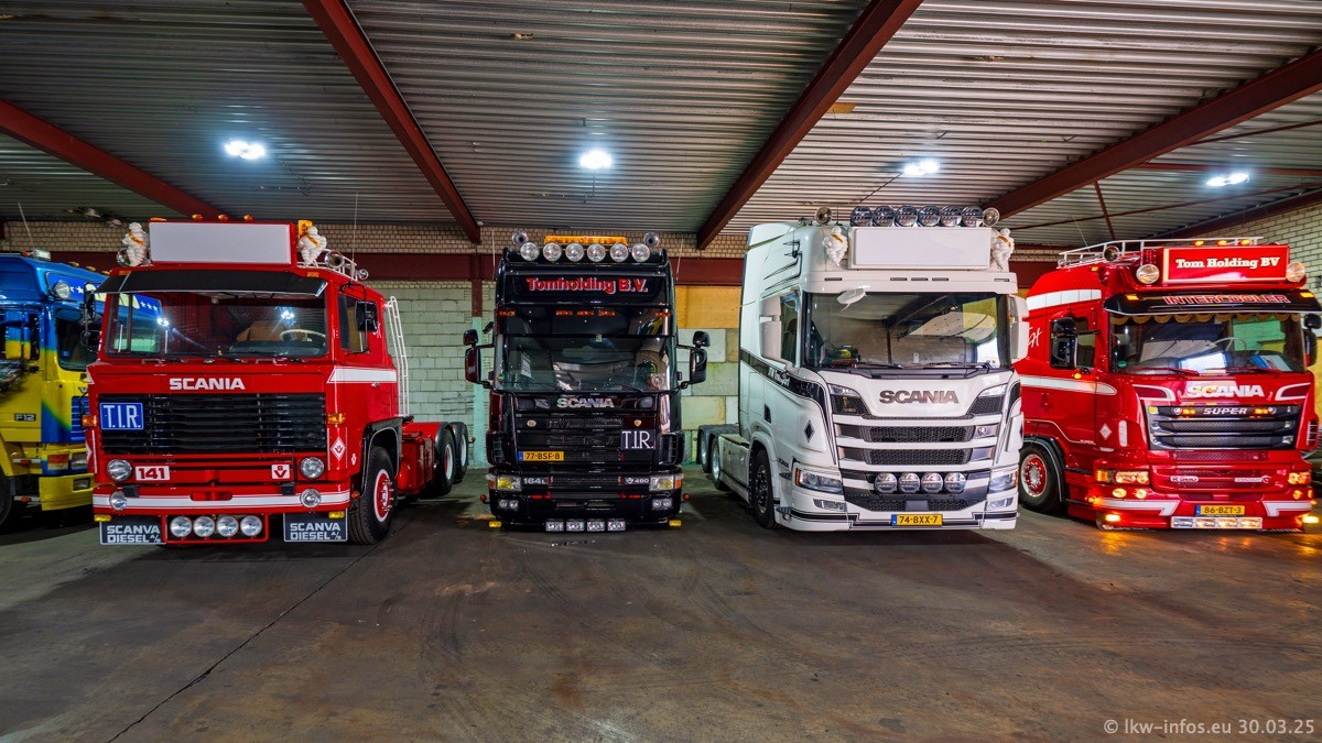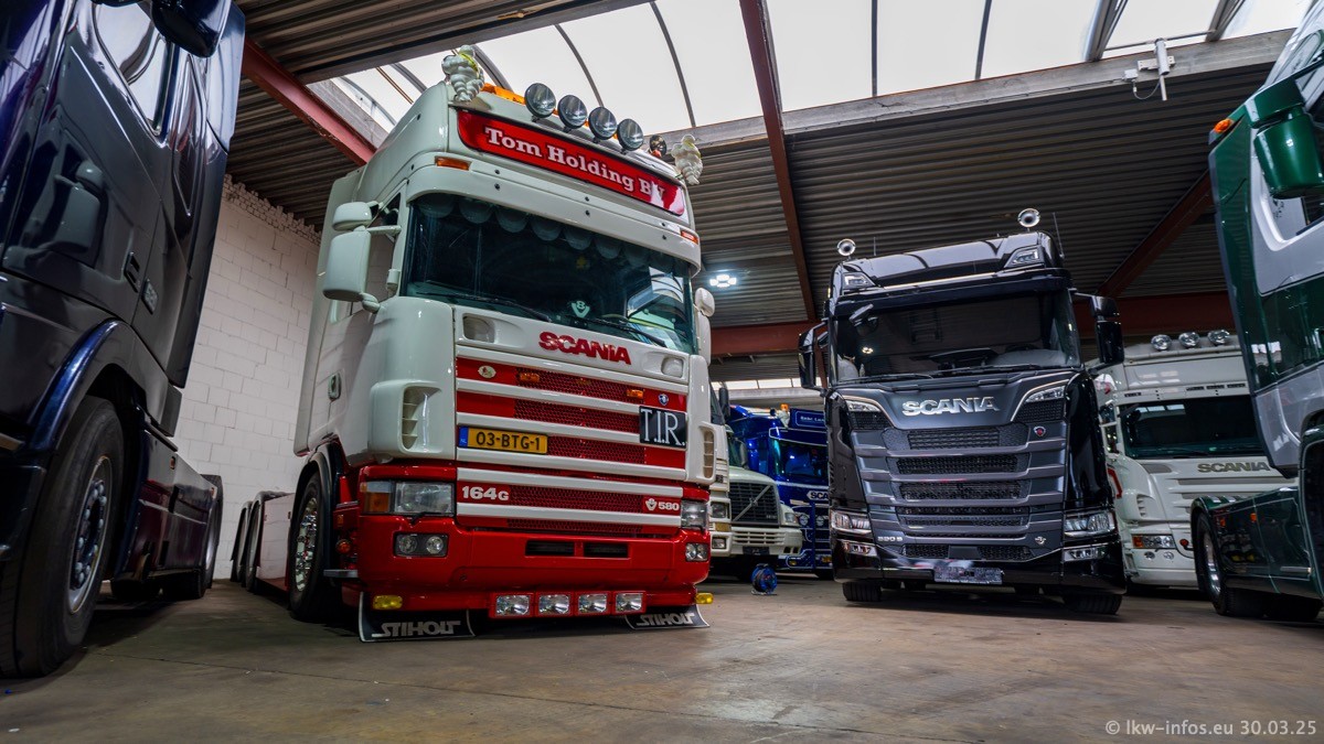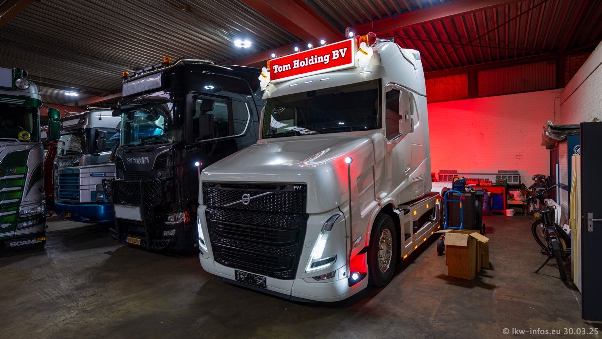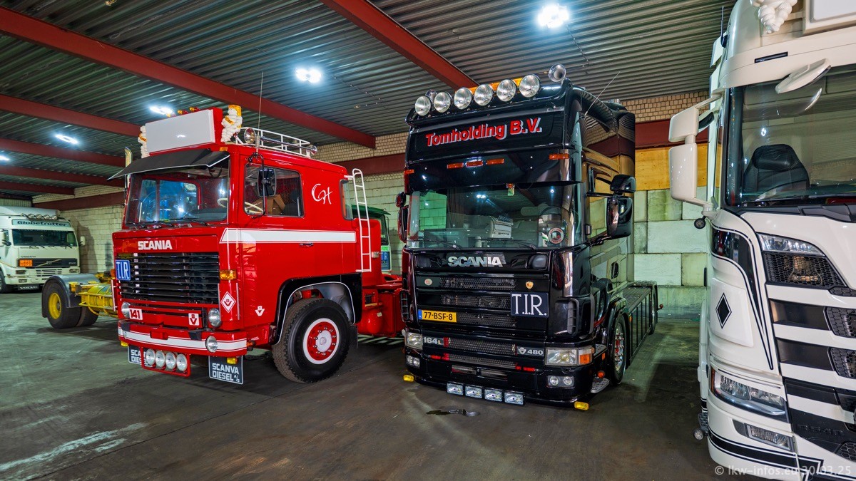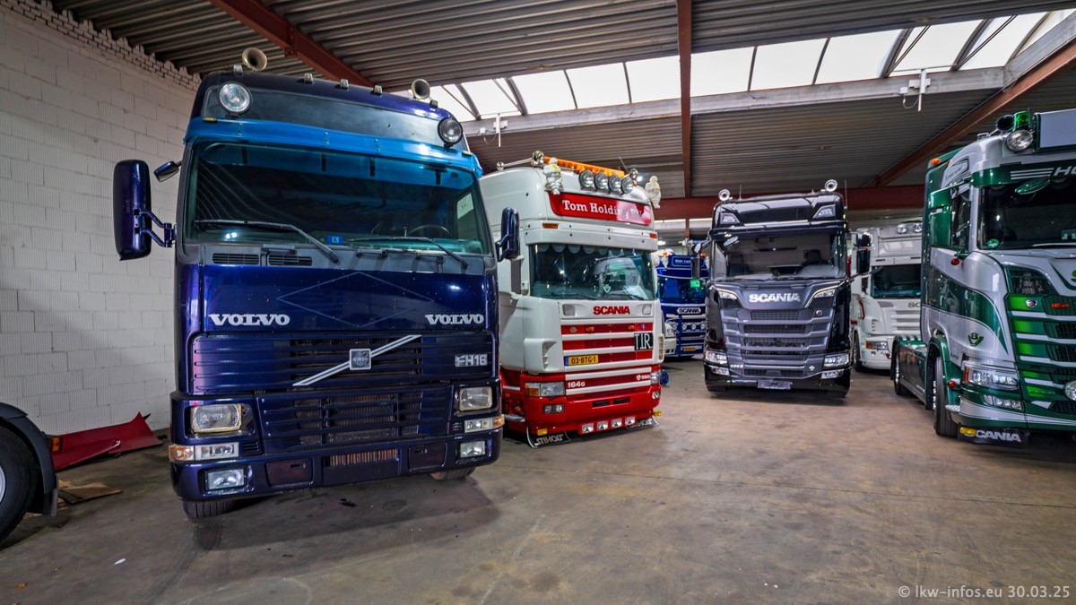 Inzwischen gibt es bei Tom Holding noch mehr Fahrzeuge als bisher, darunter auch einige neue. Der VOLVO VT 5 460 (die Nr. 15 von Vlastuin) ist neu und war eigentlich für einen Kunden in Dänemark gedacht, der das Fahrzeug aber nicht gekauft hat. Die beiden roten SCANIA 141 V8 und R 560 V8 kommen von einer bekannten deutschen Firnma und es gibt aktuell einge SCANIA V8 Showtrucks, die zum Verkauf stehen. Darunter auch wieder ein Fahrzeug von Lansdaal. Diesmal haben wir ein reines Fotoshooting gemacht da es aktuell so viele Fahrzeuge gibt. Videos und Film gibt es dann beim nächsten Besuch wieder.