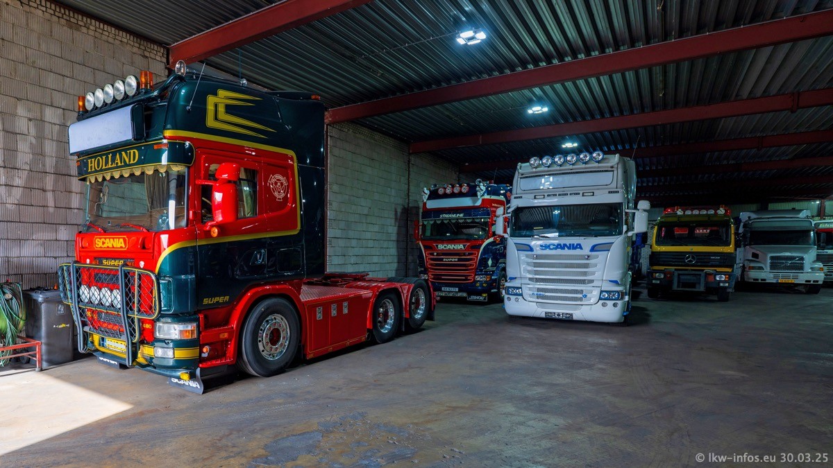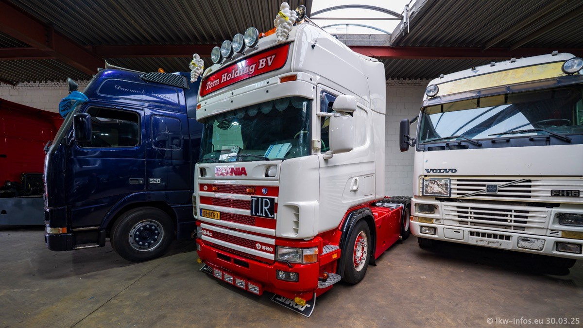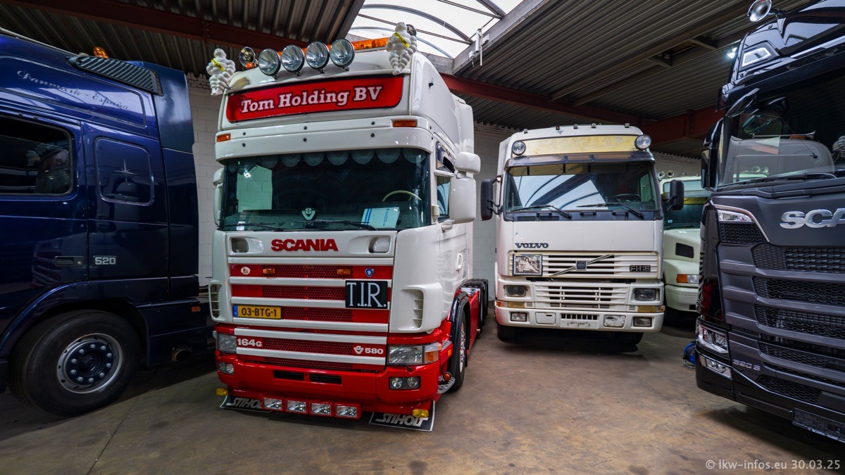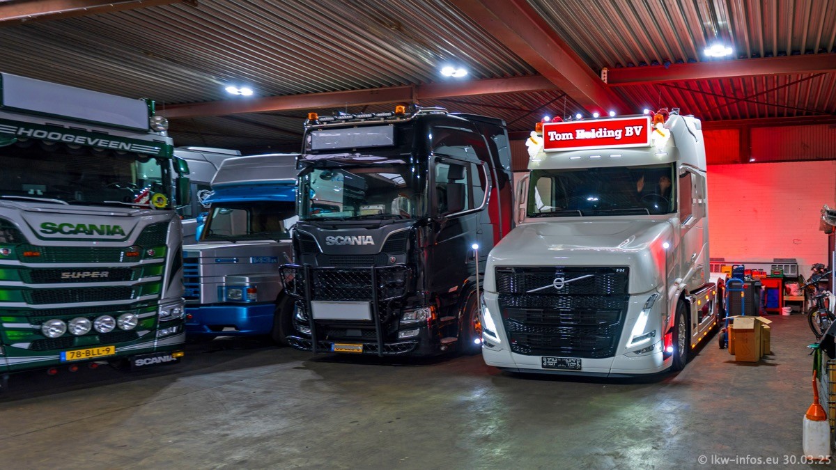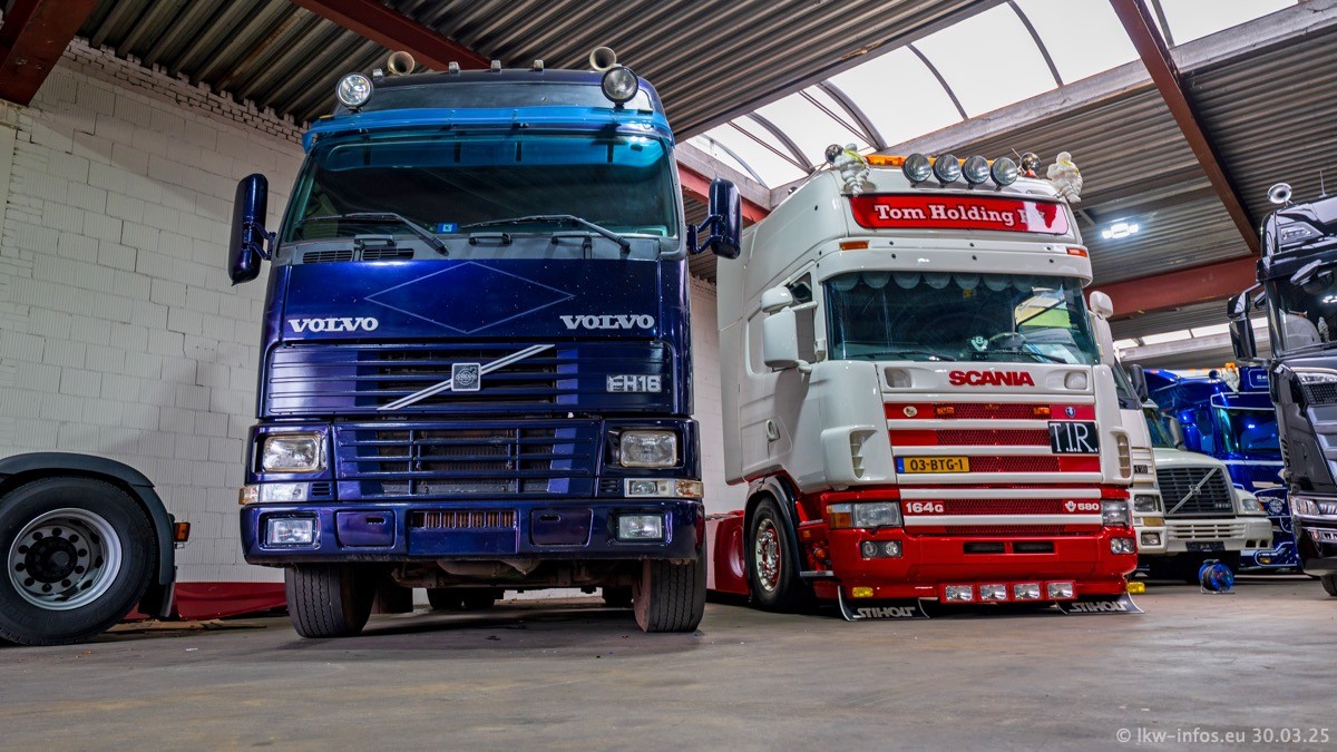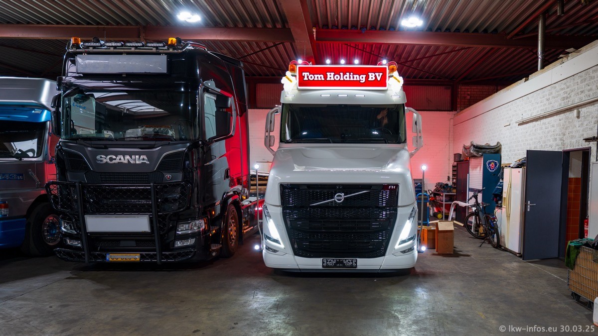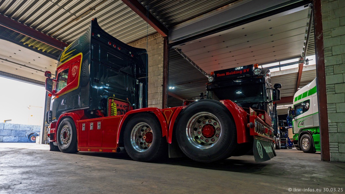 Inzwischen gibt es bei Tom Holding noch mehr Fahrzeuge als bisher, darunter auch einige neue. Der VOLVO VT 5 460 (die Nr. 15 von Vlastuin) ist neu und war eigentlich für einen Kunden in Dänemark gedacht, der das Fahrzeug aber nicht gekauft hat. Die beiden roten SCANIA 141 V8 und R 560 V8 kommen von einer bekannten deutschen Firnma und es gibt aktuell einge SCANIA V8 Showtrucks, die zum Verkauf stehen. Darunter auch wieder ein Fahrzeug von Lansdaal. Diesmal haben wir ein reines Fotoshooting gemacht da es aktuell so viele Fahrzeuge gibt. Videos und Film gibt es dann beim nächsten Besuch wieder.